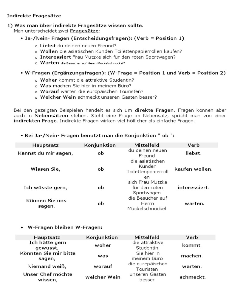 Klasse 7 Menü umschalten. Das konjugierte Verb steht wie bei den anderen Nebensätzen die du bisher gelernt. Indirekte Fragesätze wirken höflicher.